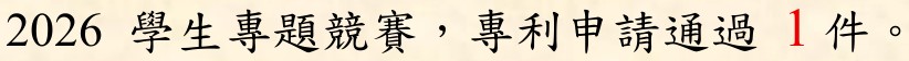 2026 學生專題競賽,專利申請通過 1 件。 (附件如圖)