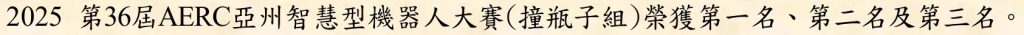 2025 第36屆AERC亞州智慧型機器人大賽(撞瓶子組)榮獲第一名、第二名及第三名。 (附件如圖)